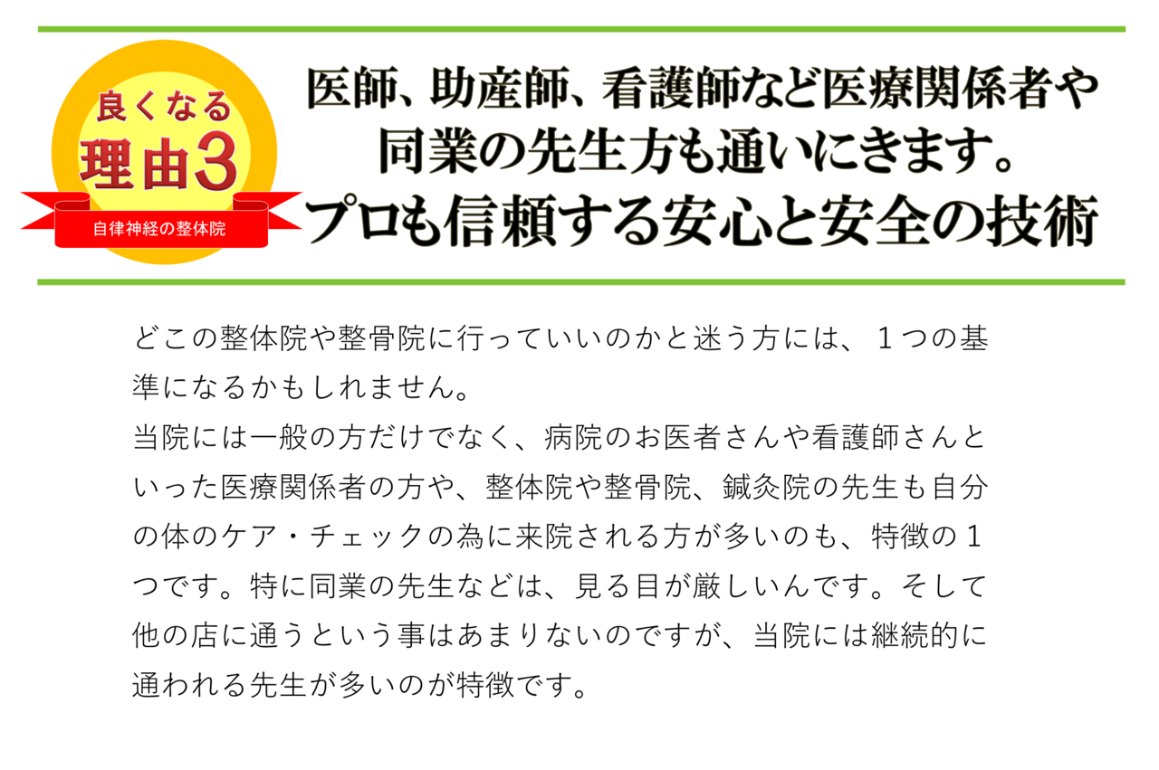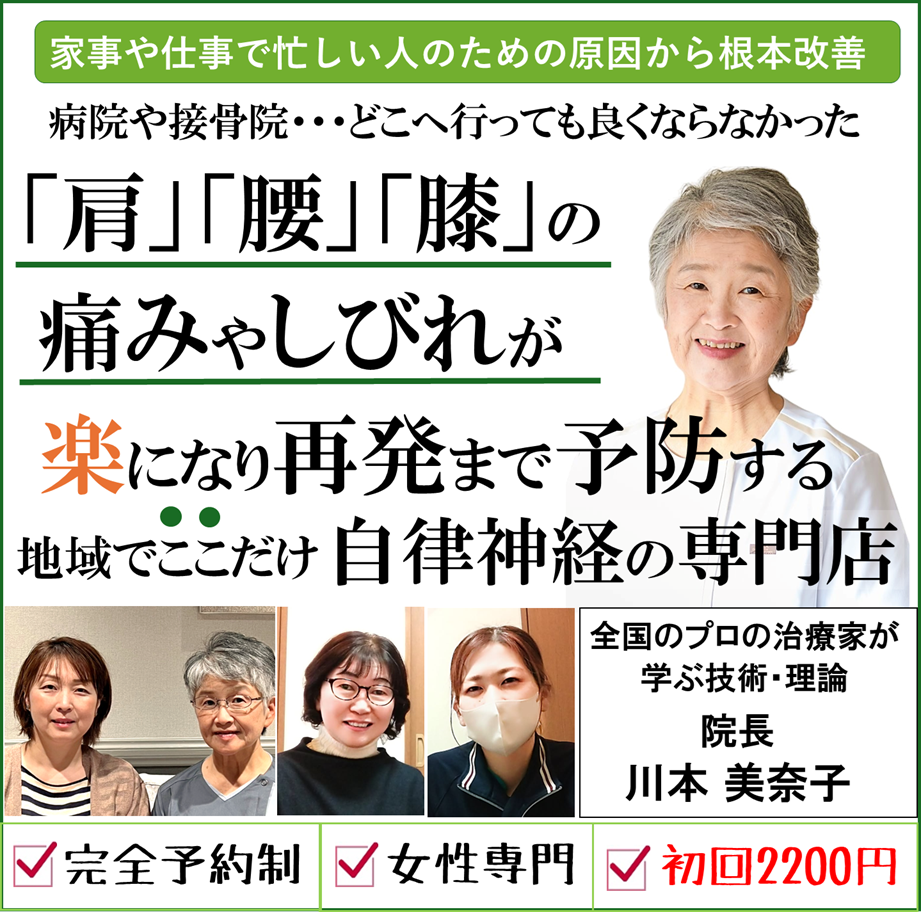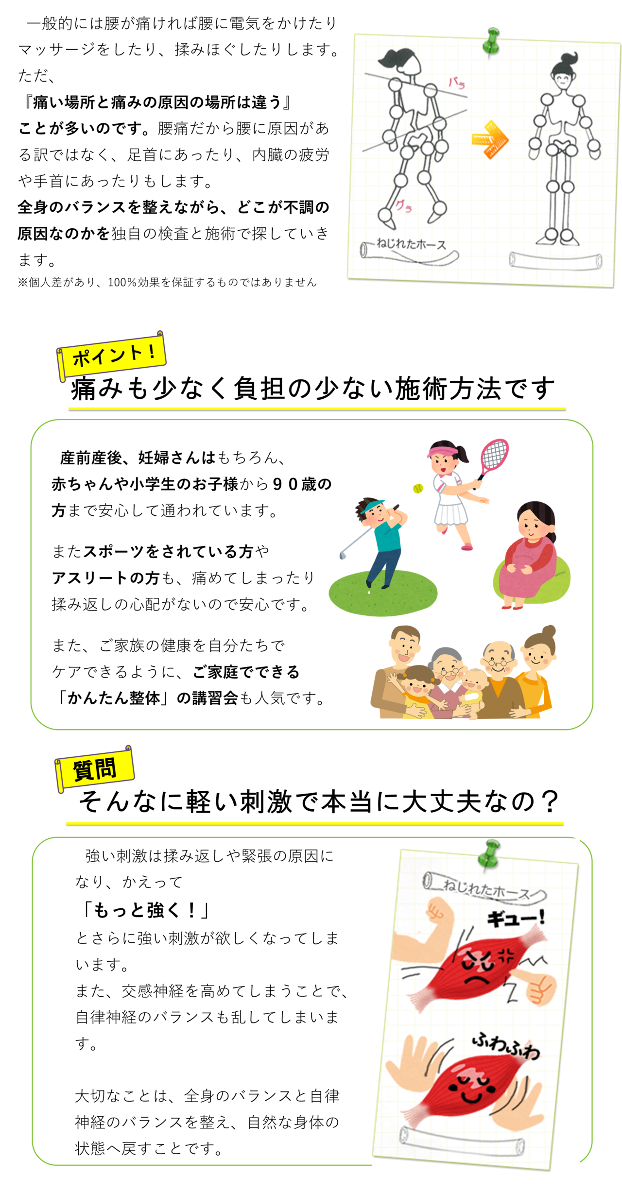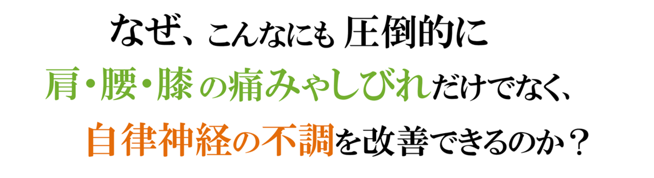 そのいずれも痛い場所ばかりを追って、全身のバランスに不可欠な「自律神経」に着目せずに体の歪みだけを原因にしています。体の歪みのほとんどは「筋肉」「内臓」「循環」などをコントロールする「自律神経の乱れ」という事実を基に生み出された、独自の理論が当院の施術です。これを受ける事ができるところは全国でも数少ないのです。