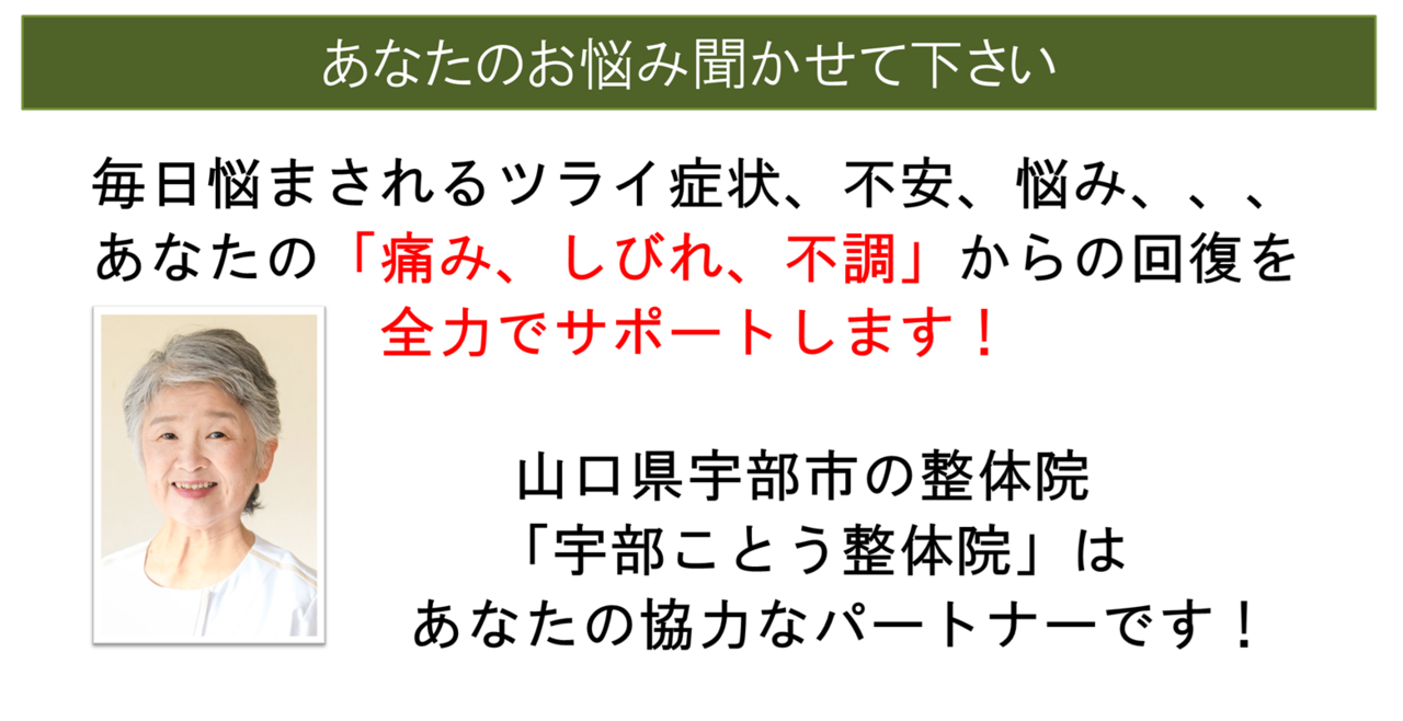 宇部ことう整体院では日本で唯一当院だけの整体技術「自律神経整体」を使い、全身のバランスを取り戻し、痛みの根本原因を取り除く事により、今まで病院や接骨院、整体院に行っても改善が見込めない方を改善へ導きます。
